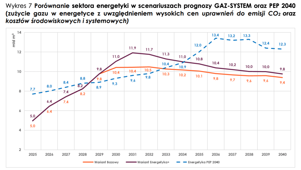 Tymczasem polska strategia energetyczna (Polityka Energetyczna Polski do 2040 roku – PEP2040) zakłada jeszcze więcej gazu, co widać w prognozach operatora gazowego. – Po 2030 roku w prognozach Gaz-System obserwowany jest spadek zapotrzebowania stanowiąc tym samym odmienny trend względem prognozy PEP 2040. Powyższe wynika z uwzględnienia w procesie prognostycznym obowiązujących polityk klimatycznych oraz założenia szczytowego wykorzystania energetyki gazowej w planowanym miksie energetycznym – czytamy w materiale Gaz-System.