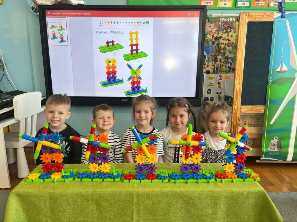 Podczas spotkania wykorzystaliśmy planszę edukacyjną o Energii Wiatru, wiatrak z Zestawu Edukacyjnego Energia Horizon a do budowy farmy wiatrowej klocki Karbo Steam zakupione z grantu przyznanego Fundacji Ośrodek Bezpieczeństwa Energetycznego przez Fundację PERN.